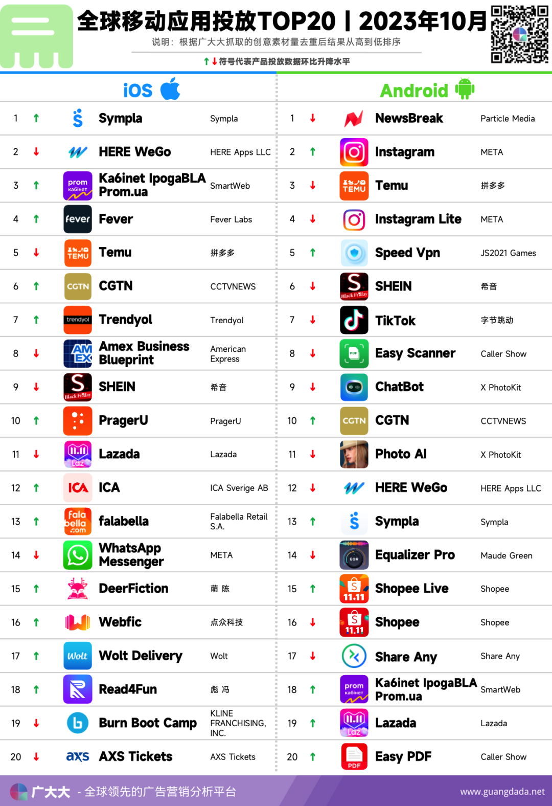 根据广大大 App Intelligence等模块数据,笔者整理出2023年10月全球移动应用(非游戏)投放、收入和下载TOP20榜单。帮助更多移动应用从业人员了解全球移动市场变化趋势。