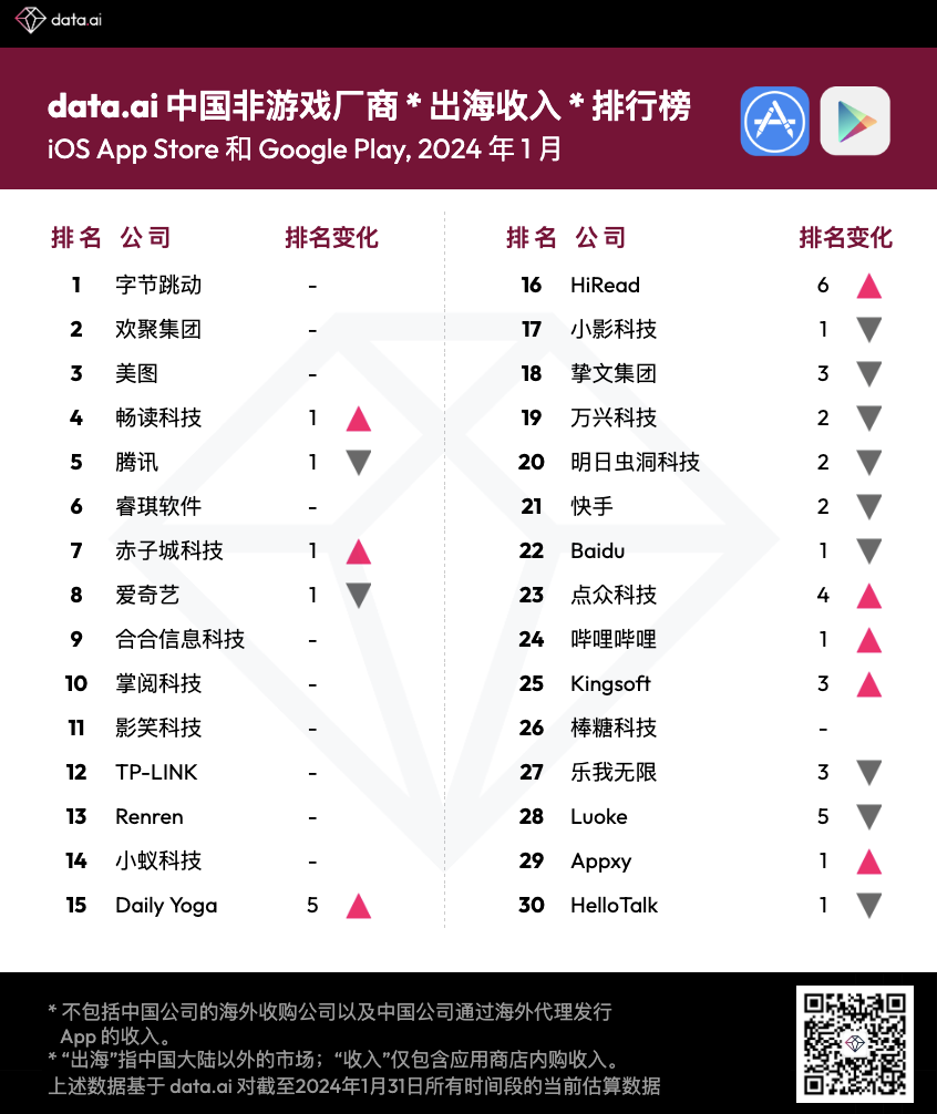 2024 年 1 月中国非游戏厂商及应用出海收入排行榜出炉。